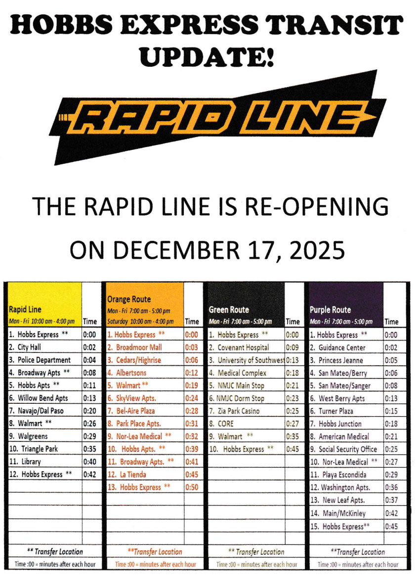Hobbs Express provides fixed-route bus service on four routes that run daily each hour throughout the community at designated bus stops. Riders can transfer to another route at various bus stop locations. Route service is available Monday through Friday, 7 a.m. to 5 p.m. and on Saturday from 10:00 a.m. to 4:00 p.m. Through the demand response program, riders may schedule a pickup from any specific location within city limits and receive curb-to-curb transportation service. Demand response service is available Monday through Friday, 7 a.m. to 5:00 p.m. and on Saturday from 7:00 a.m. to 4:00 p.m. All demand response rides must be scheduled at least one day in advance.